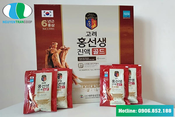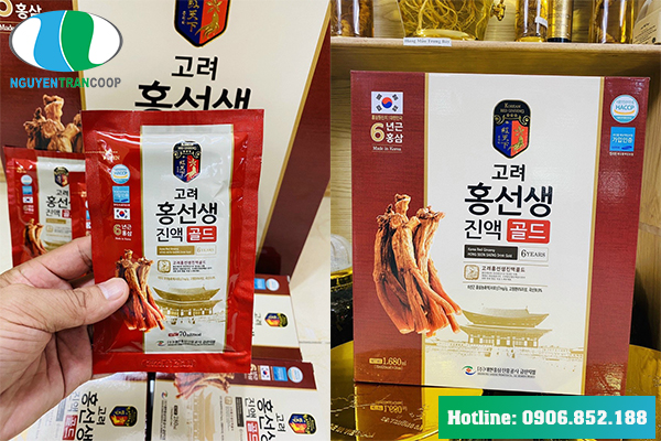Sản phẩm được chiết xuất từ hồng sâm từ 6 năm tuổi trở lên, qua quá trình xử lý và chế biến cho ra loại túi nước hồng sâm, mỗi túi 70ml chứa hàm lượng hồng sâm đúng theo quy chuẩn các chuyên gia khuyên dùng.